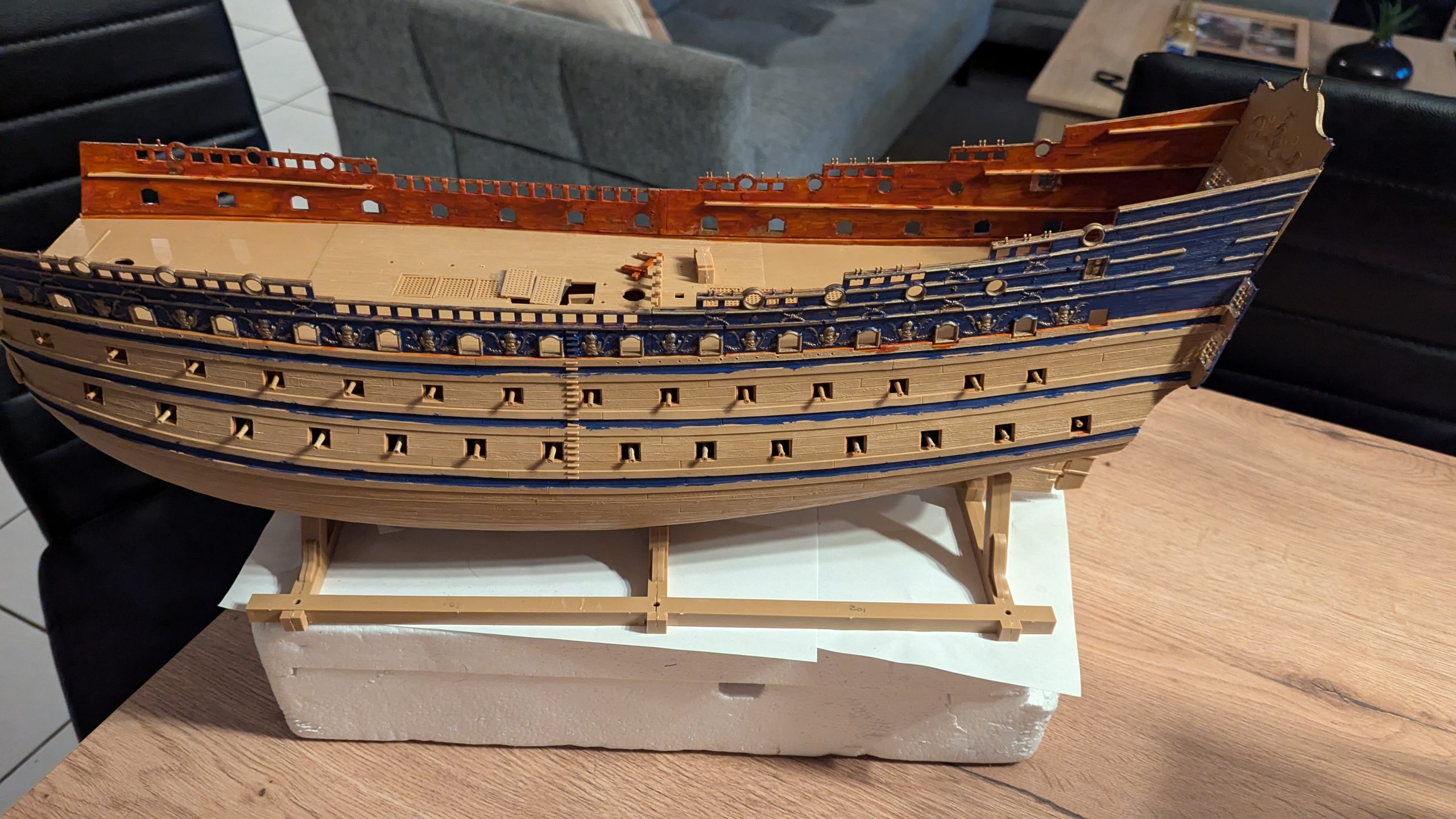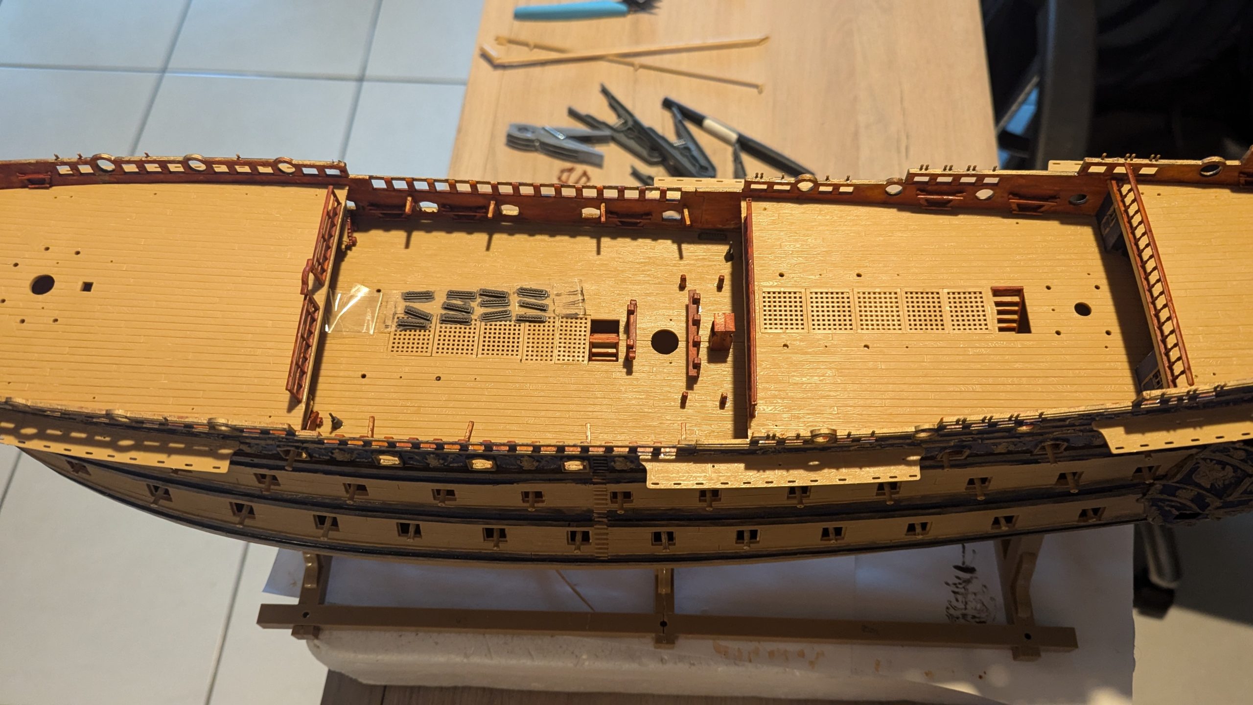 – –/– (prévision) : Ajout des détails sur le pont et la coque, peints (chaloupes, trappes, …).