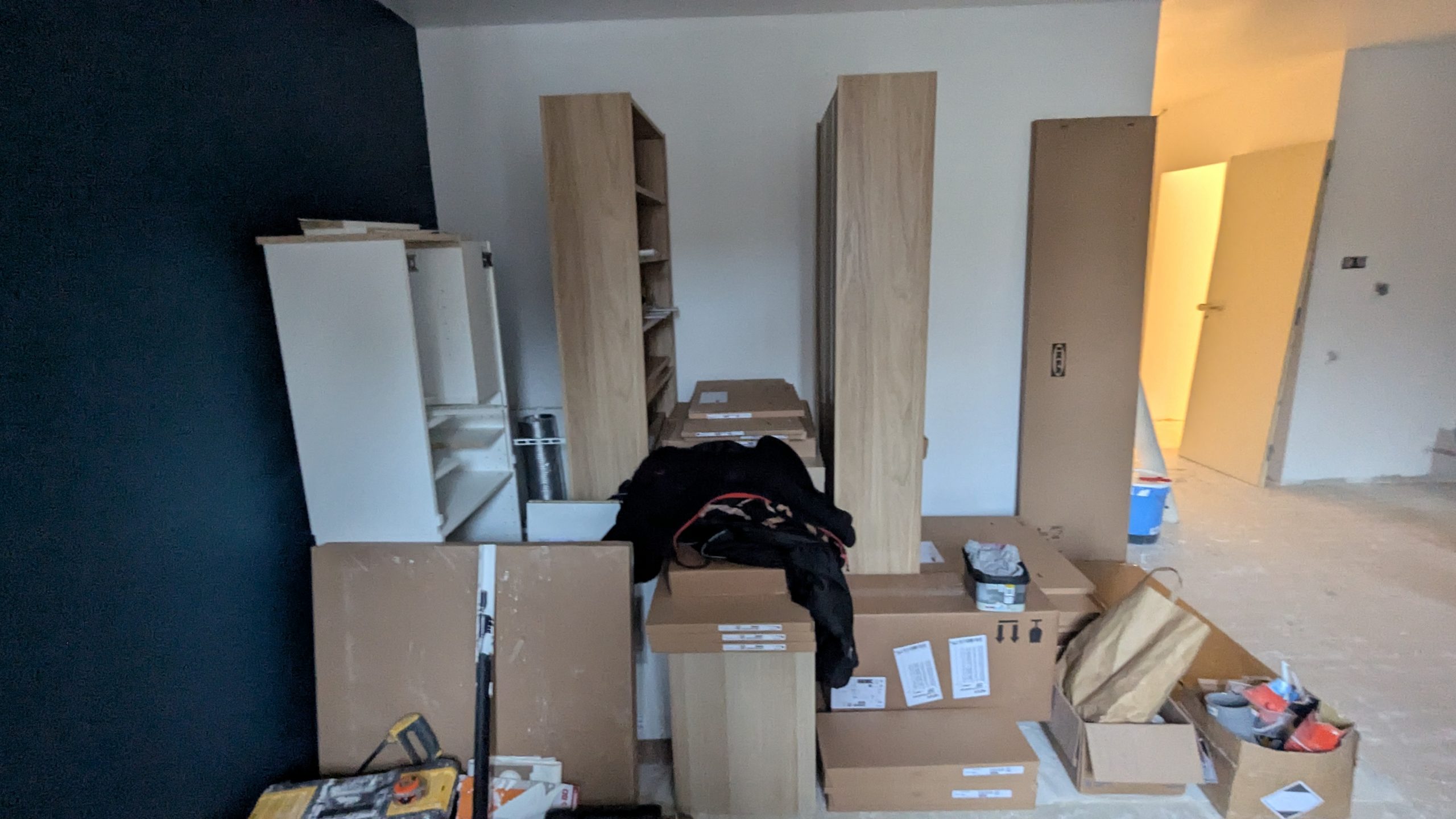 Pour changer, encore du montage de meubles (cette fois de la cuisine), avec le meuble de la hotte, celui de l’évier, et un placard mural. La lumière automatique dans l’entrée fonctionne également au top, et idem pour le sèche-serviette.