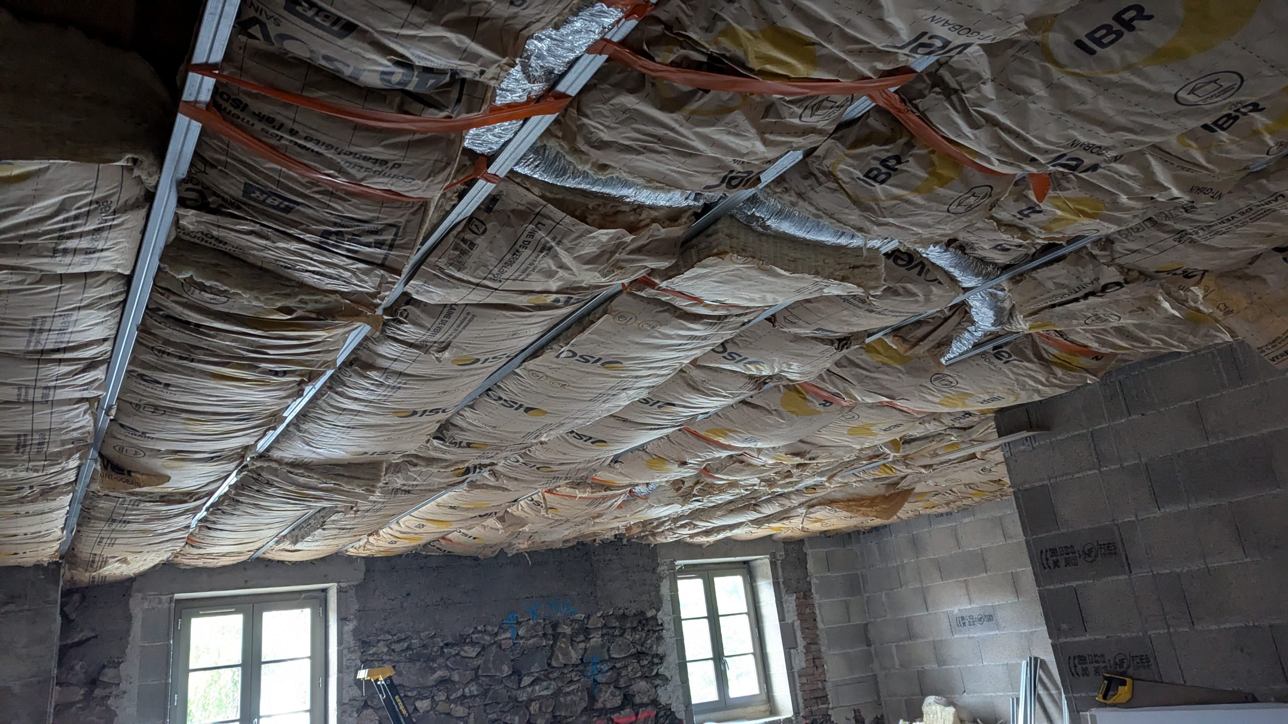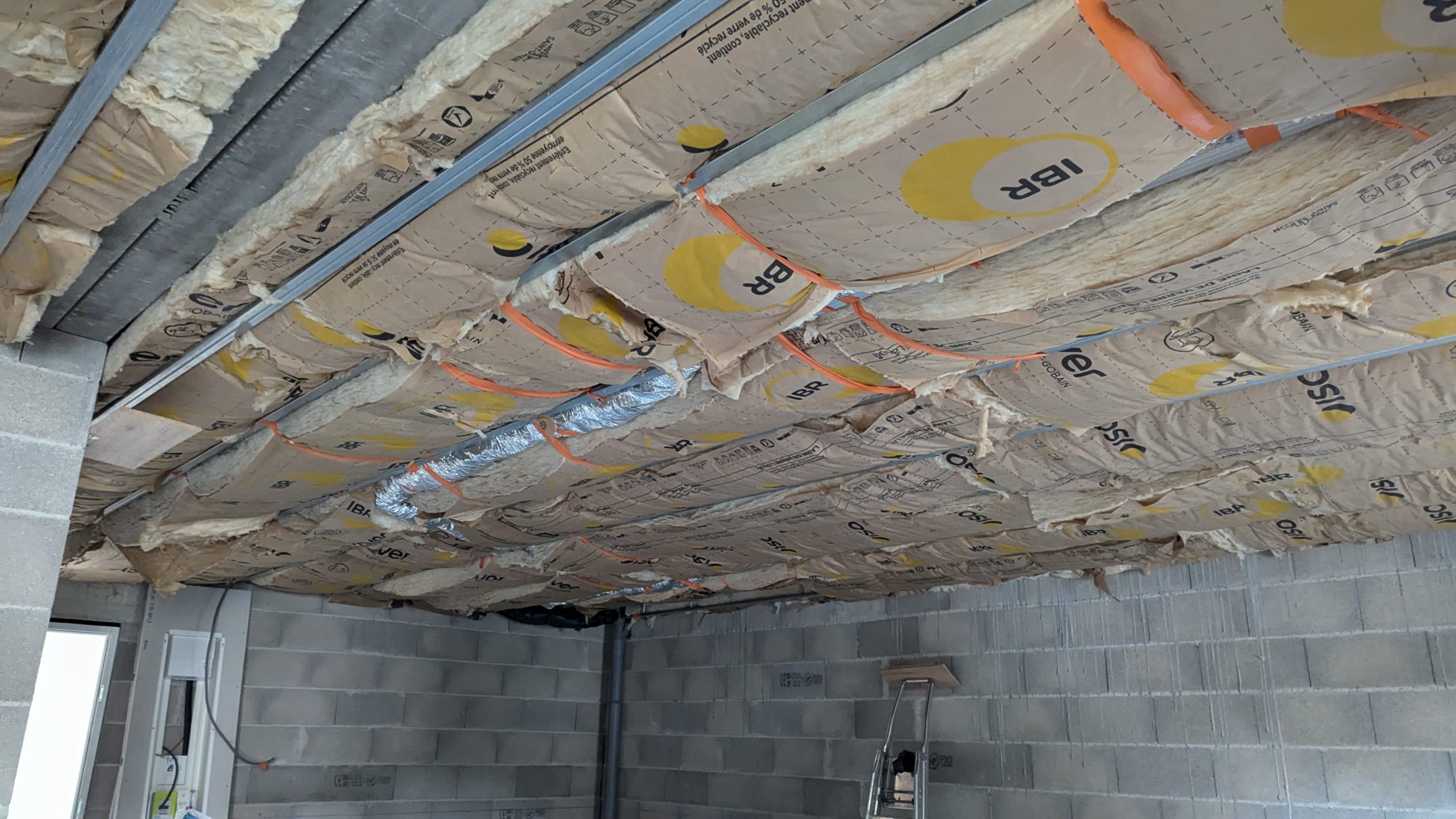 Aujourd’hui montage des fourrures terminé, et on a commencé l’isolation et la gaine de VMC. Ah l’isolation, un grand moment…